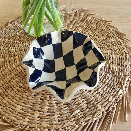 Black Checkers Handpainted ruffle bowl, eclectic style