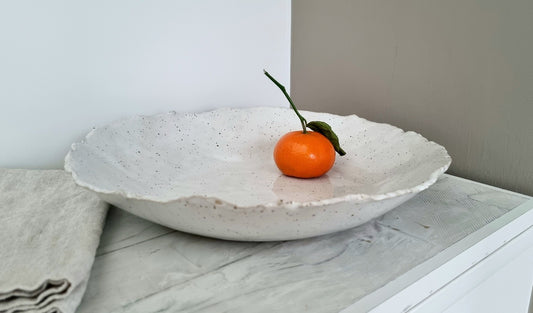 White handmade ceramic organic bowl with black speckles and hand formed rim