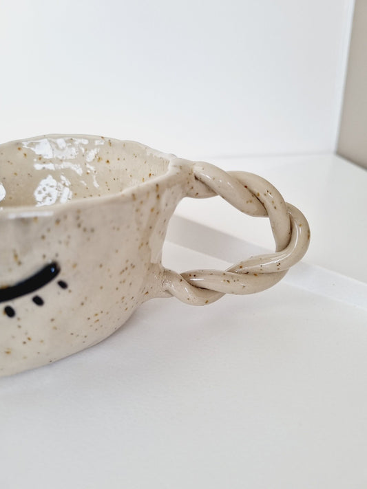 Handmade hand shaped whimsical mug with face, speckled clay.