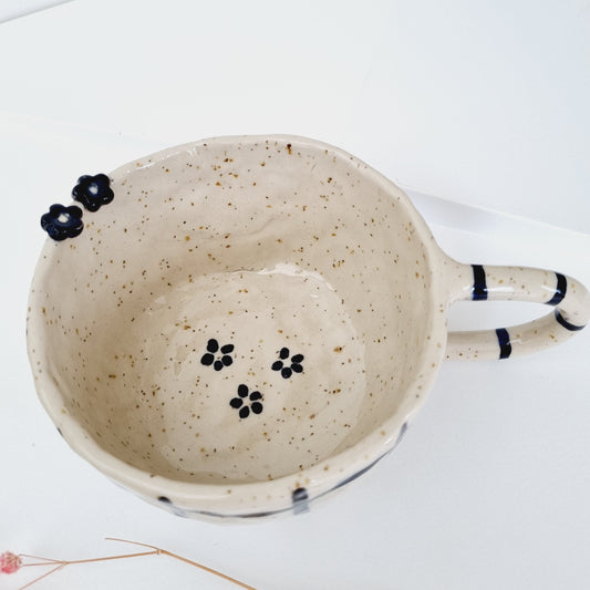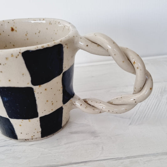 Mug with bold handle unique handmade checkers mug handpainted , flower stem handle, gift for artistic person.