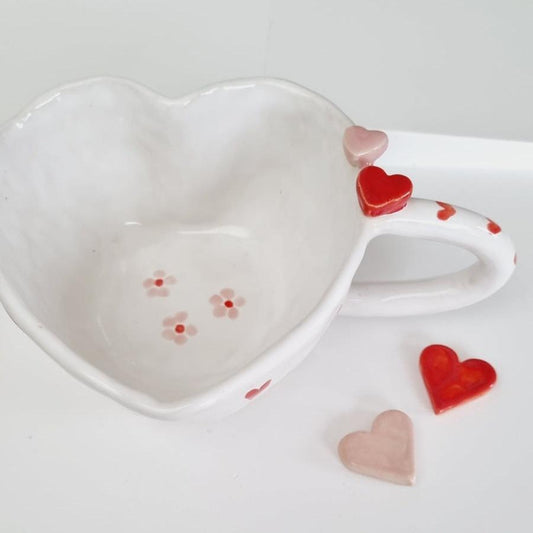 Heart shaped romantic mug, hand painted pink and white hearts and daisies