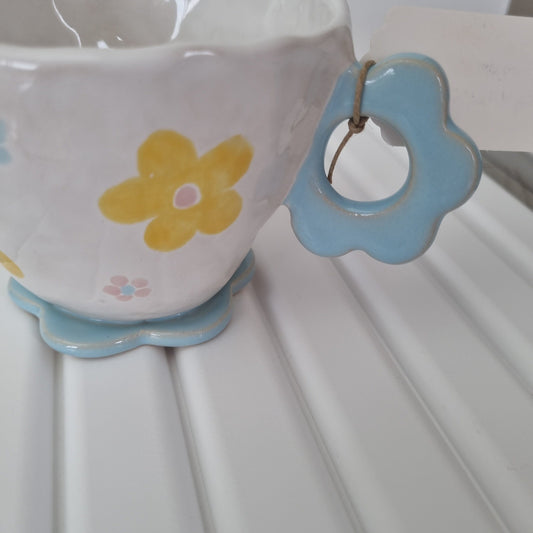 Girly, cute mug with hand painted blue and yellow daisies, handmade romantic gift.
