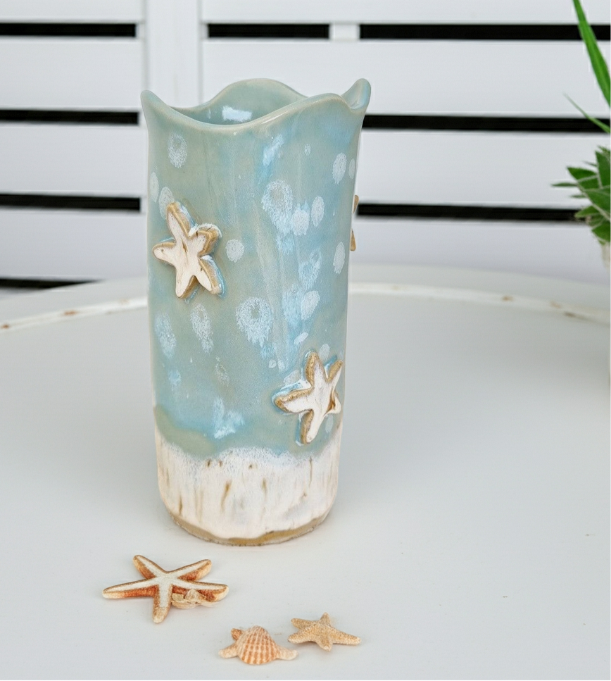 Bringen Sie mit unserer Coastal-Vase einen Hauch von Meer in Ihr Zuhause. Handgeformte und skurrile Vase. Diese mit 3D-Keramik-Seesternen verzierte Vase verleiht jedem Stranddekor eine schöne Note. Die blaugrüne Glasur erinnert an die Farben von Meeresschaum und smaragdgrünem Wasser, während der gewellte Rand die Wellen des Ozeans nachahmt. Eine perfekte Ergänzung für Ihr Zuhause oder ein aufmerksames Geschenk für einen Strandliebhaber. Kann auch als Cocktailbecher verwendet werden.