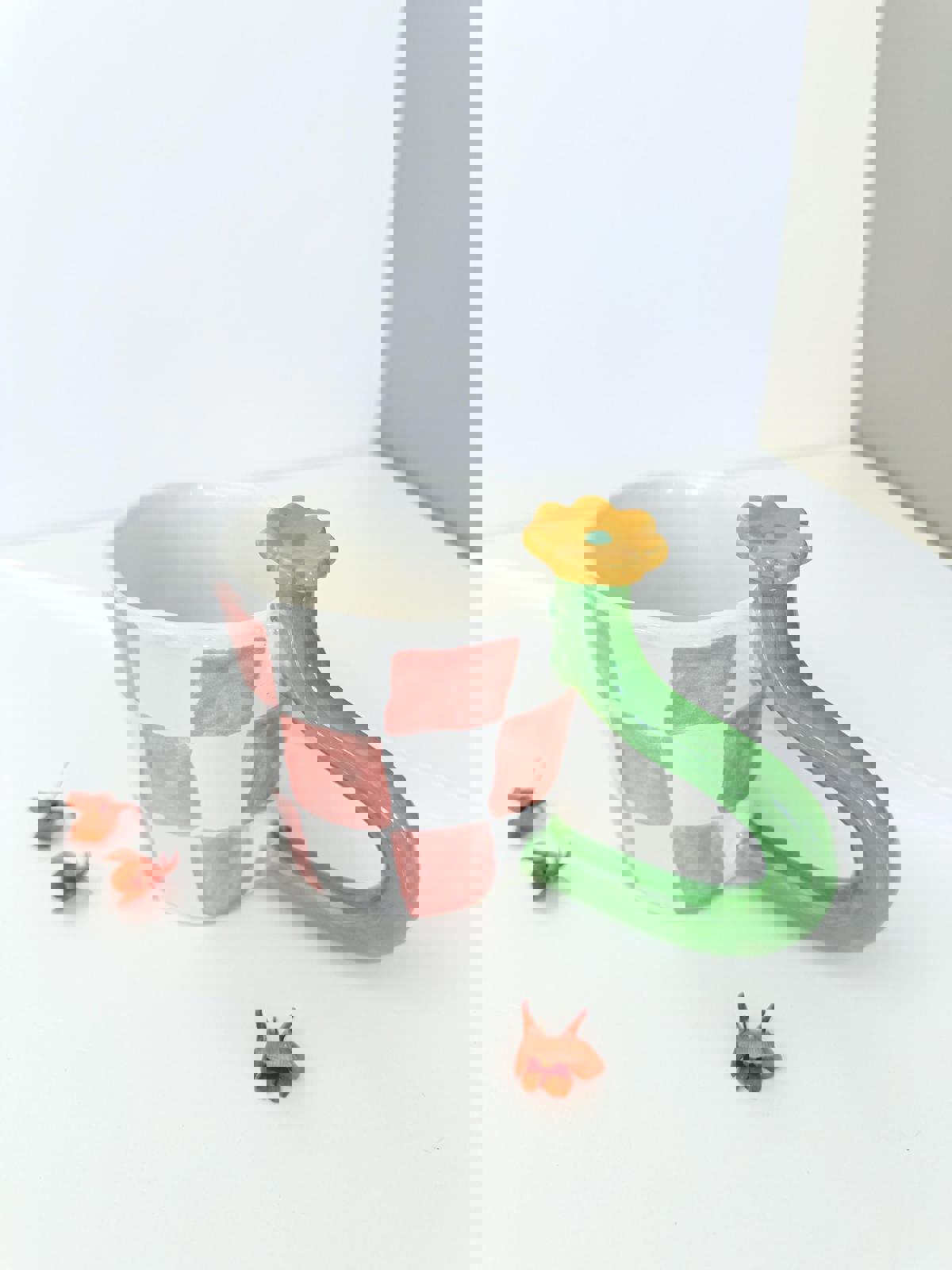 Unique mug with a bold green flower stem handle. Hand painted burnt orange checkers pattern. Decorated with a cute ceramic flower on the stem. One of a kind mug for coffee lover. Gift for women.