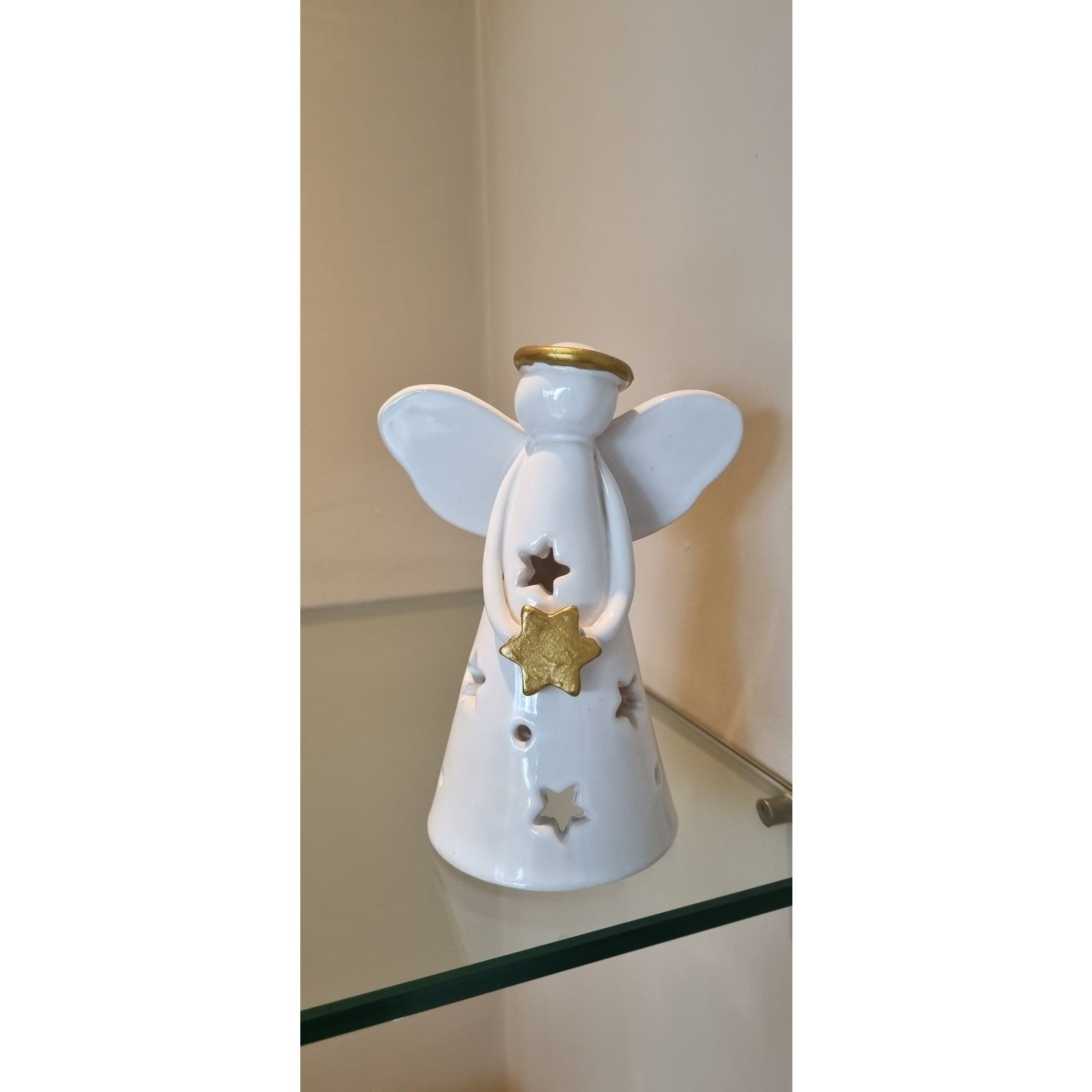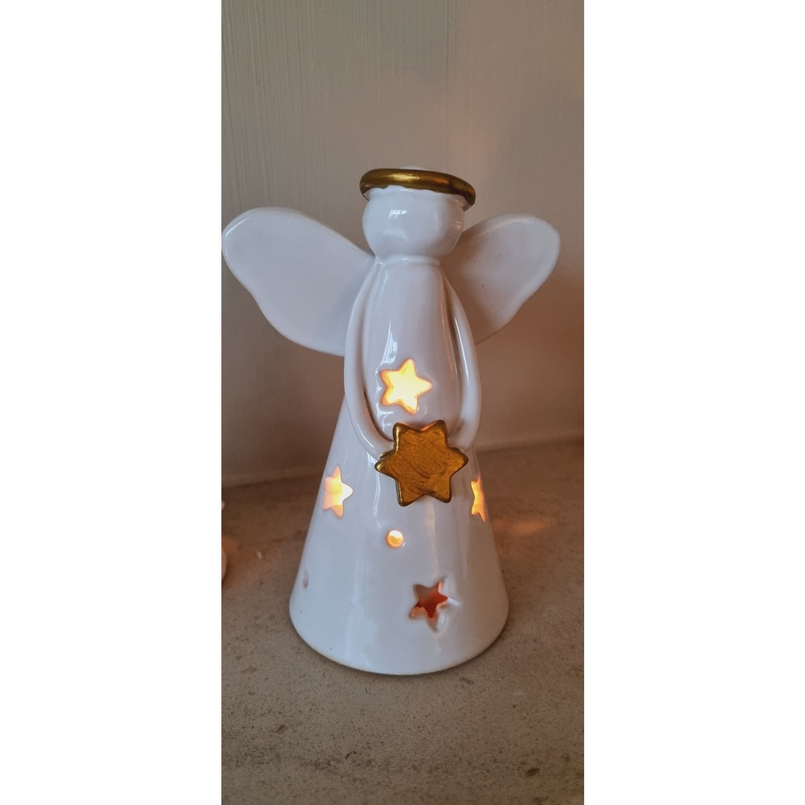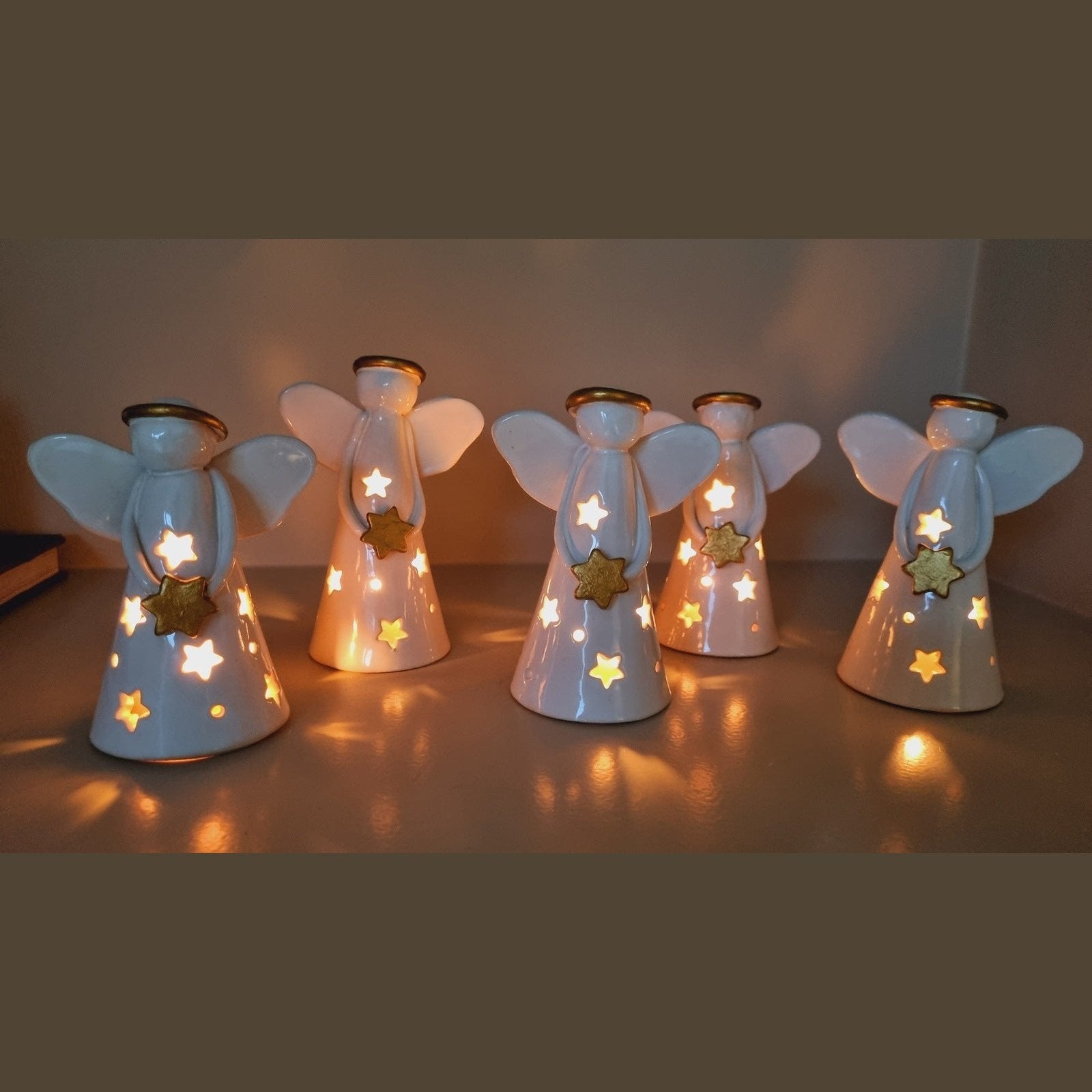 Each of these Christmas Angels have star cut outs, creating intriguing shadows and providing a glimpse of the dancing flame within. This Angel luminary exudes elegance and charm. Perfect for creating a cozy and festive ambiance during Christmas.