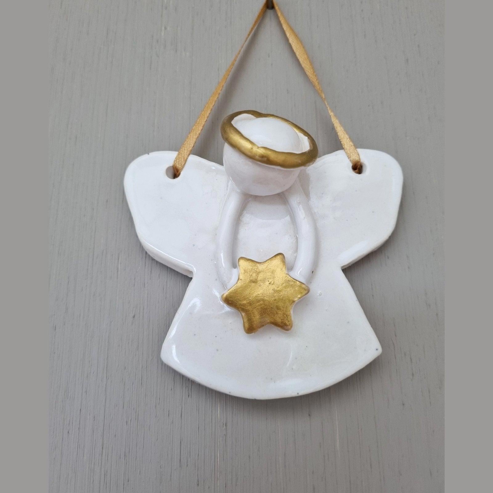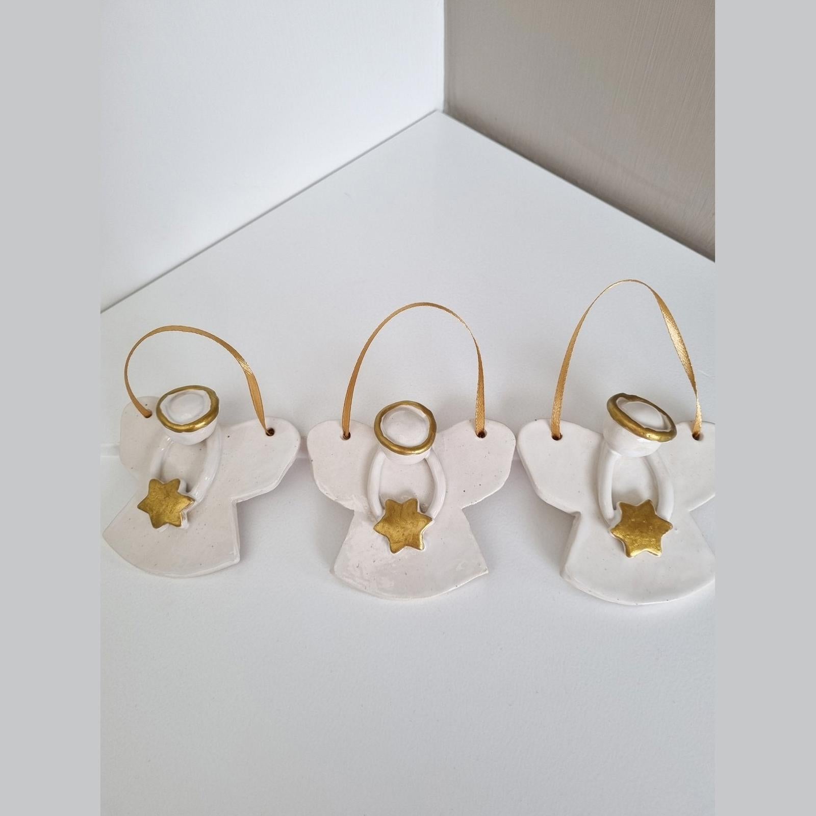 This handmade Ceramic Angel Ornament adds a touch of elegance to your Christmas tree. White with golden accents. Let this angel watch over your tree with grace and beauty.